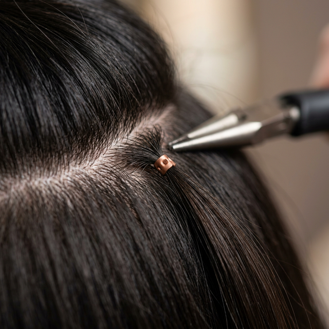 Separamos tu cabello en secciones ultra-finas. Cada mechón de extensión se fija con una micro-anilla de silicona usando una pinza especial. El proceso dura entre 2 y 3 horas según la cantidad de extensiones. No se necesita calor, pegamento ni ningún producto químico.