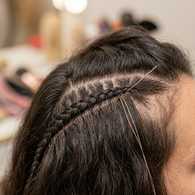Creamos una base de trenzas pegadas al cuero cabelludo en las zonas de instalación. Sobre esa base cosemos las cortinas de cabello con hilo quirúrgico. El resultado es un volumen espectacular con una base completamente plana e invisible.